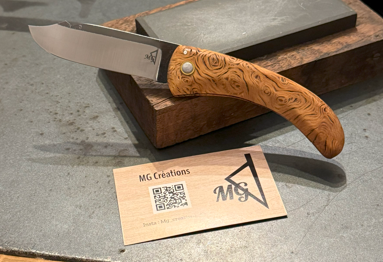 Magnifique manche en loupe de chêne liège offrant des nervures dessinant presque une rose. Pièce montée avec lame carbone en XC75. Toute la beauté de la nature transpire dans cette pièce d'exception.
