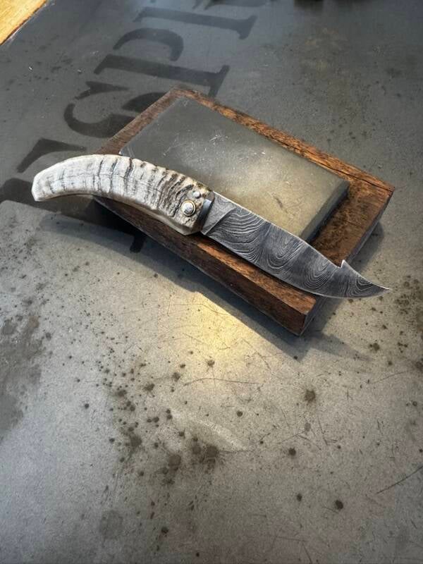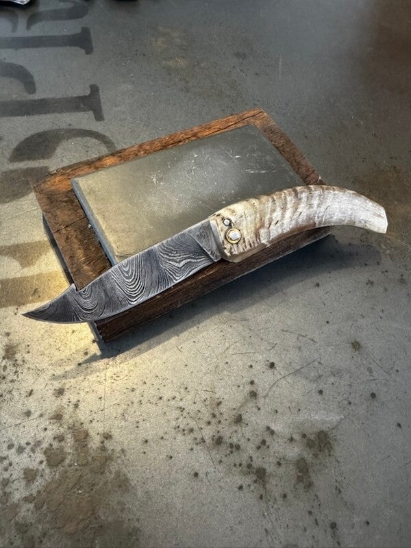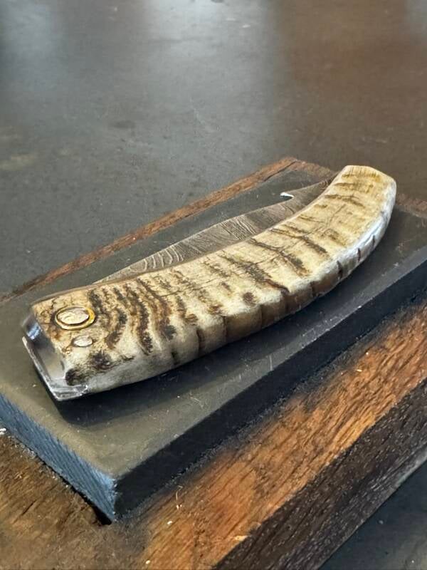 Magnifique manche en corne de chèvre blonde de caractère. Pièce montée avec lame damas. La forme de cette dernière inspire la mer.