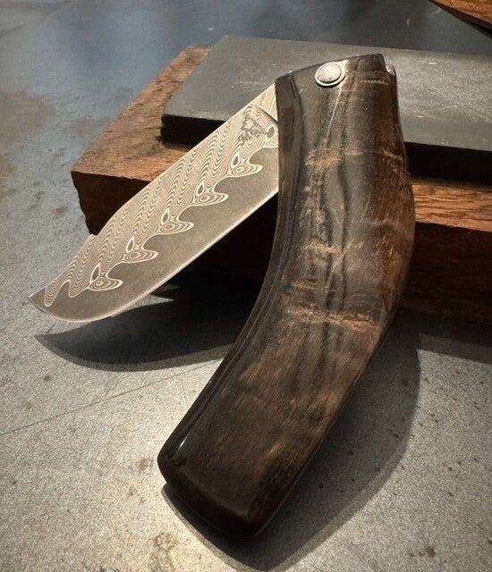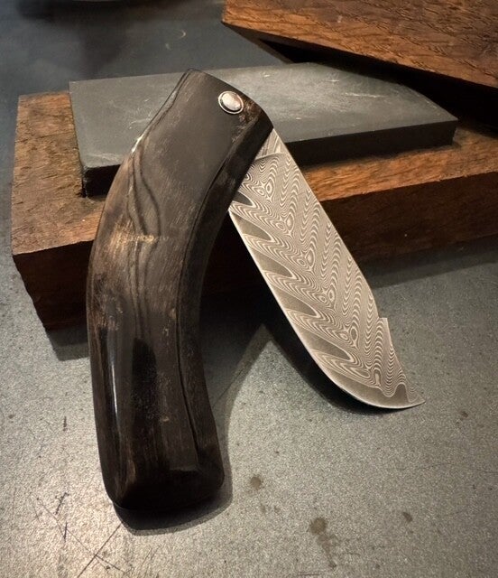Magnifique couteau en corne de bouc monté avec une lame damas.