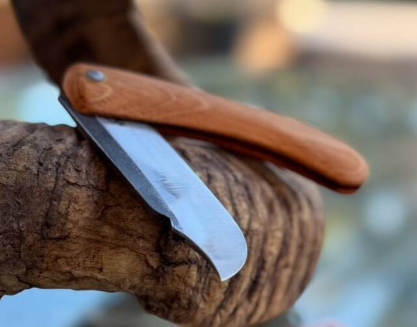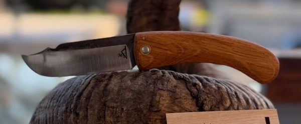 Couteau pliant en chêne vieilli et lame en acier carbone XC75.