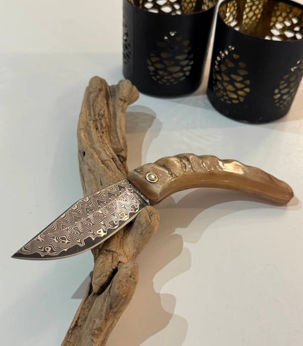 Magnifique pièce en corne de bélier blonde sanguine montée avec une lame en damas.