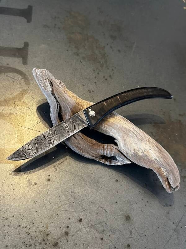 Magnifique Curnichjolu en corne de bouc noire et lame en acier damas.
